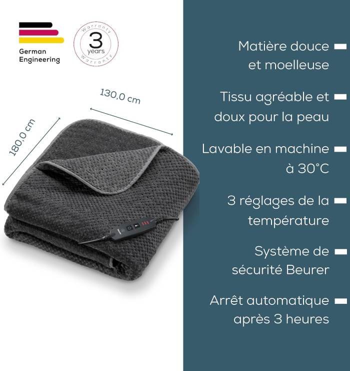 Couverture chauffante Beurer HD65 – Plaid électrique doux, lavable et sécurisé